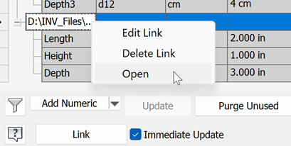 To open the linked file, right-click the filename-path in the Parameters dialog and click Open.