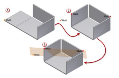 On the left, a work point is created using an unfolded model feature. On the right, a second work point is created using the same vertex on the folded feature. A third work point is created on another folded feature, and a workplane is created using the three work points. In the lower image, the workplane remains in place when the feature is unfolded or refolded.