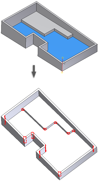 | | - All Fillets option: Concave edges. For example, in the incident edges rule above, the All Fillets option filters the edges as indicated.