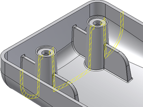 (Optional) In the Ribs tab, select Stiffening Ribs and enter the Number of Stiffening Ribs around each boss as well as the Rib Thickness, Rib Draft, Shoulder Length, Top Offset, Shoulder Radius, and Flare Angle.