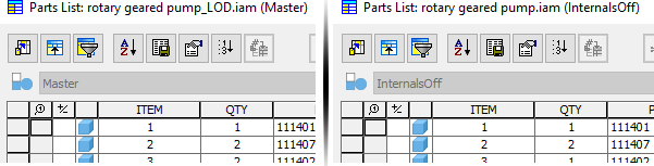 The parts list for a model state created from a migrated non-Master LOD uses the Master model state Bill of Materials. The parts list for a substitute created from a migrated LOD substitute also uses the Master model state BOM. The parts list for a substitute uses the model state BOM of the source assembly.