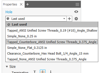 Quickly place holes using presets, or specify the hole dimensions, drill point, termination, and thread type options using the property panel.