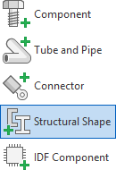 The following commands are located on the Design tab in the Assembly and Weldment environment. Structural Shape Authoring is located on the Manage tab in the part environment.