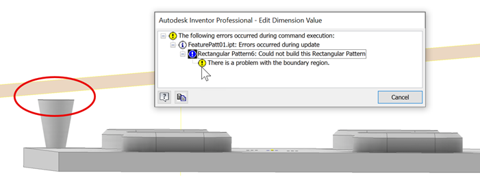 Adjust. Creates potentially differing copies of selected features by patterning features and calculating extents or terminations of each pattern occurrence individually. Computation time is lengthy for patterns with large numbers of occurrences. Preserves design intent by allowing pattern occurrences to adjust based on feature extent or termination conditions, such as a feature that terminates on a model face. Not available for patterns of solid part bodies in an open or surface state.