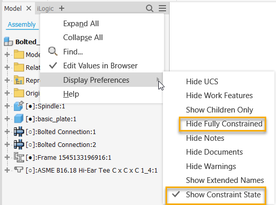 Unknown A dash indicates the constrained status of the component is unknown. To resolve this state, rebuild the assembly: On the ribbon: Tools tab
