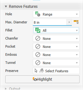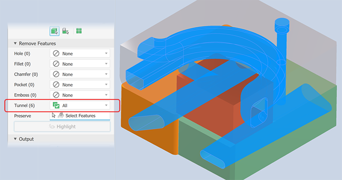 Remove Features provides options for selecting features by type and size to include in or exclude from the simplified part. The list of features include holes, fillets, chamfers, pockets (subtractive), embosses (additive), and tunnels (single and multiple entry). Internal voids are automatically removed.