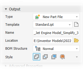 Template: sets the part template file to use for the new part file output. Choose from Sheet Metal or standard templates or navigate to a custom template. If the template field is empty an alert will show next to the field.