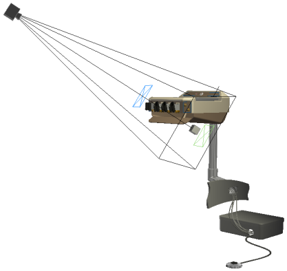 The zoom angle of the camera, and distance from the target to the position determine the width of the square. The height of the square respects the aspect ratio defined by the stored rendering settings. For example, if the rendered image size is 640 x 480, the height of the square is 3/4 the width. A shape that is a combination of a truncated pyramid and a box is displayed at the position point. The roll marker, a small black vertical line at the middle of the top edge of the view volume square, indicates the up direction of the camera and is also a handle used to adjust the roll angle.