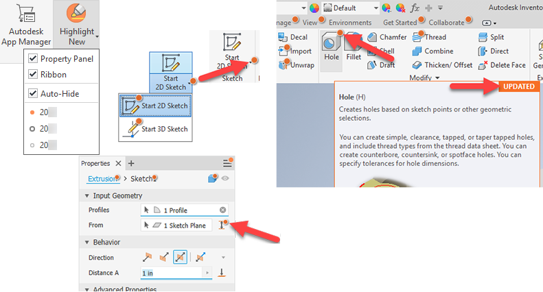 To hide the badges, deselect either Property Panel or Ribbon. At any time, you can turn them back on and refresh your memory about the new or updated commands.