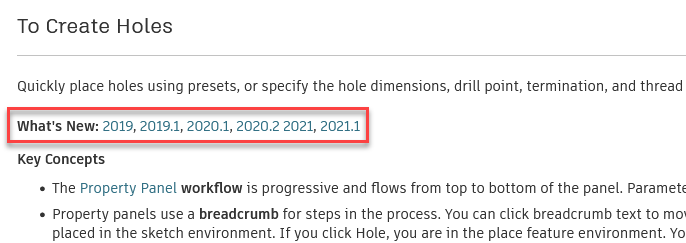 Content pages for new and updated commands display a link back to the What's New topic. The links show the release in which a related change took affect.