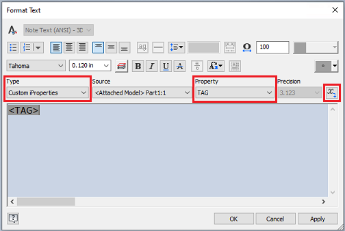 In the Format Text dialog box, in the Type list box, select Custom iProperties.