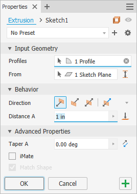The Extrude command uses a property panel to define the feature. If you are not familiar with Inventor property panels, see About Property Panels