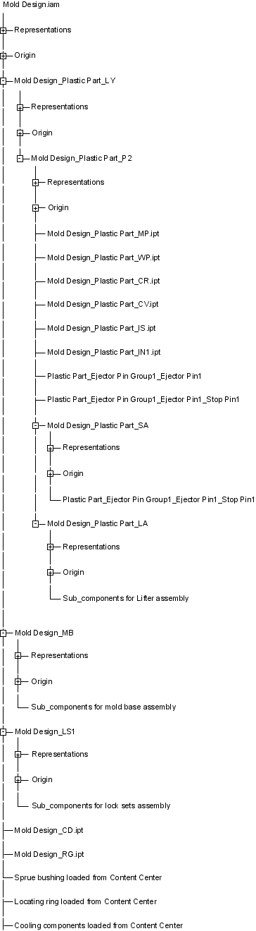 A Mold Design assembly typically contains standard components that you can customize, and other components.