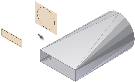 For press brake output, create a transitional shape from a flat face and a cylindrical bend face using two sketch profiles and appropriate options.