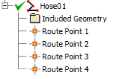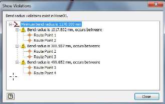 Use Bend Radius Check to check for bends that violate the specified Minimum bend radius. You can run a bend radius check on a selected flexible hose route. An icon is displayed beside the route in the browser if violations are detected.