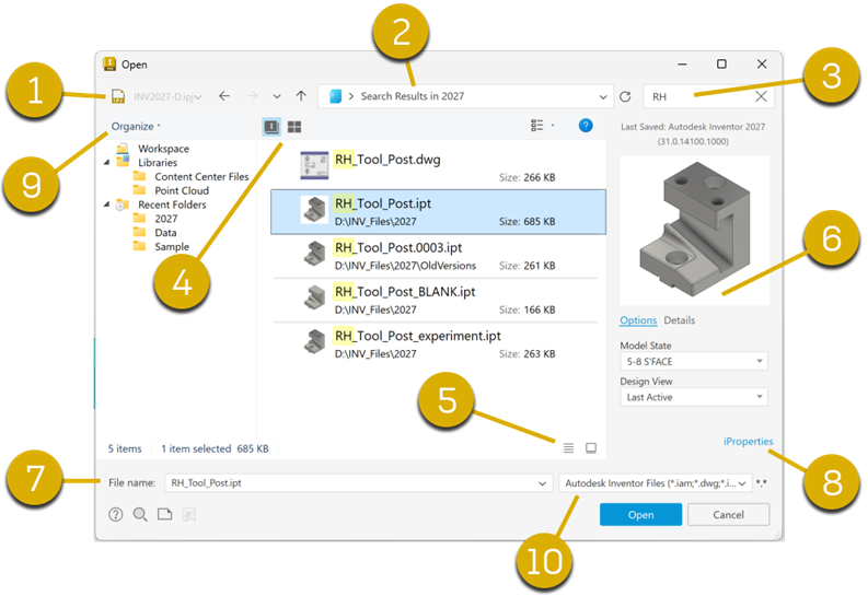 File type provides the list of file types Inventor can open. Select a specific type to reduce the file list.