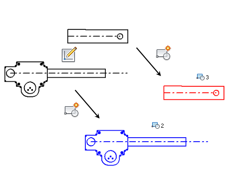 The designs of many assemblies repeat rigid shapes. Sketch blocks can capture such shapes as a fixed set, and you can place instances of the set. For example, say that you have a 2D sketch that represents a hydraulic cylinder, and there are four hydraulic cylinders in your assembly. If you have a sketch block that represents the hydraulic cylinder, you can place four instances of the block into your assembly layout. The instances are defined in the sketch block and reflect any changes to the block design.
