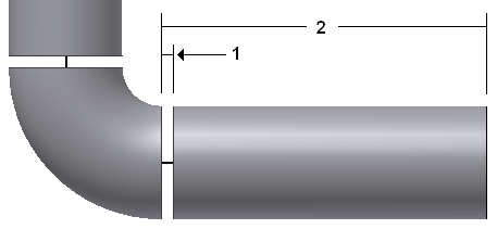 If a butt weld style is selected and gaps are set to display, gaps are automatically added between pipe segments and pipe segments and fittings. Gap display is set in the style. For gaps between a pipe and a fitting within a route, the gap distance (1) is subtracted from the end of the pipe segment (2). The same behavior is true between pipe segments and fittings used to start and end a route.