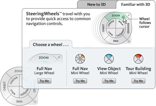 SteeringWheels, also known as wheels, are tracking menus (that follow your cursor). They combine many of the common navigation tools into a single interface. .
