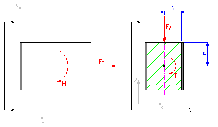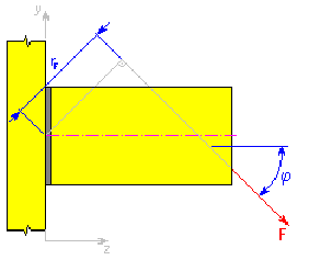 For calculation purposes, the common force F can be substituted by the combination of shearing force F Y acting in the weld plane with the axial force F Z and the bending moment M acting in the plane perpendicular to the weld plane. Then the stress in the weld for so defined loading can be calculated using the above mentioned procedure.