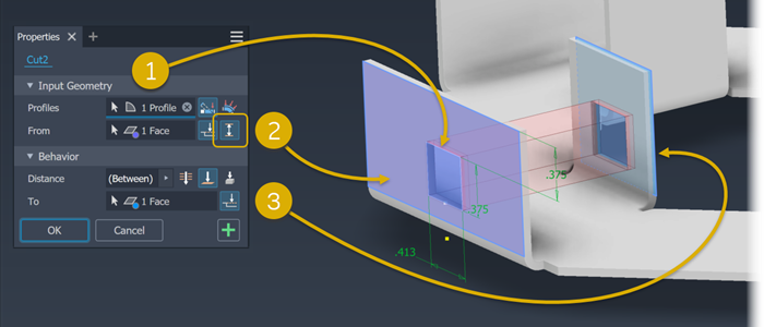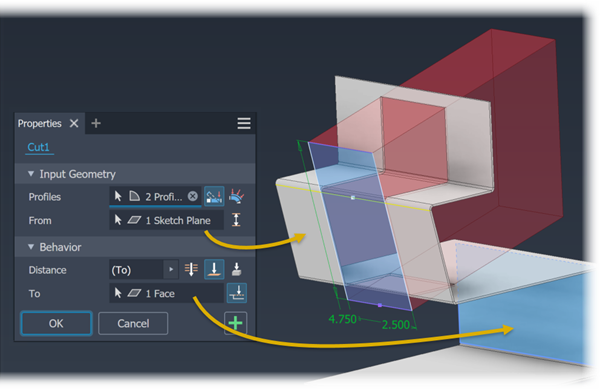 To: Extrudes the cut profile to the selected face or work plane. (You can terminate the cut on a face that extends beyond the termination plane.) In an assembly, the face or plane can be on another part. Specify whether the cut extends beyond the selected face.