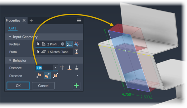 Distance. Establishes the depth of the cut. The default method creates a cut perpendicular to the sketch plane. To the right of the Distance field, click the method you want to use to define the distance. The cut feature result previews in red.