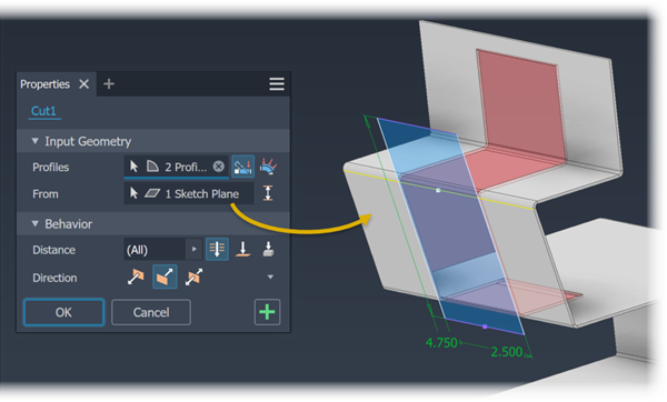 . Flips the direction of the cut from the default setting. Useful when the cut sketch is created on a reference plane. When the sketch is created on a sheet metal face, results in no material removal.