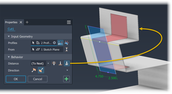 To Next: Selects the next possible face or plane on which to terminate the extrusion in the specified direction. Use this selector to pick a solid or surface on which to terminate the cut and determine the direction.