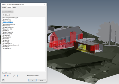 The Classes tab lets you use IFC classifications to manage what is included or excluded from the import.
