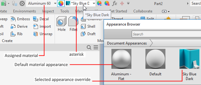 Note: Materials have default appearance assignments. When you override the appearance an asterisk is added before the name in the QAT. This is done so you are aware that the assigned appearance is not the default appearance.