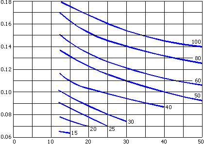 Geometry factors, I, for straight bevel gears. Pressure angle = 20 degrees, shaft angle = 90 degrees. (From AGMA Information Sheet 215.91).