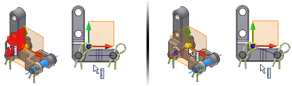 The center of gravity symbol contains three selectable work planes and a selectable work point. Select the work planes to measure distance along the perpendicular axis. Use the work point to measure straight line distance.