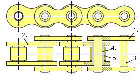 The Roller Chains generator is intended to design chain drives with roller and bush chains. The chains can have single strand or multiple strands. The double-pitch chains are also supported. Typical construction of roller and bush chains is shown in the following picture. The main difference is that bush chain does not have a roller.