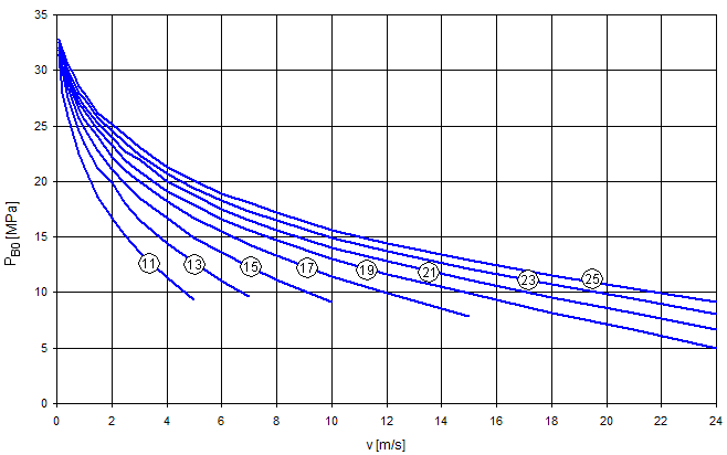 The values of permissible pressure in chain bearing area shown on the chart below apply to normal operating conditions only. For specific operating conditions the value is corrected by specific friction factor λ what results in total permissible pressure. The total permissible pressure is then compared with the actual pressure in chain bearing area.