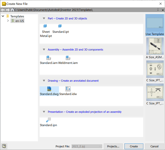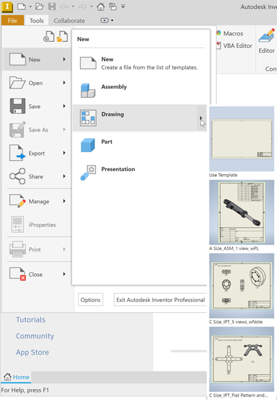 In the New flyout, hover over Drawing to display the template and sheet format options.