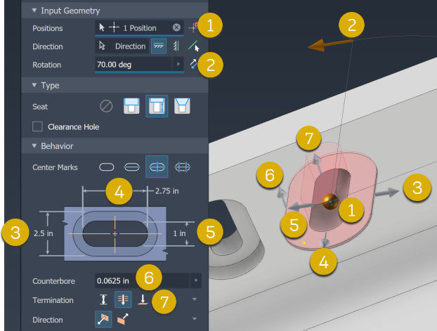Seat specifies whether the hole will be plain or have a specific mating feature, usually related to fastening components. The choices are: