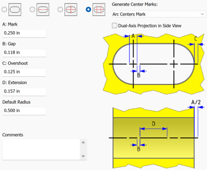 Generate Center Marks, in the dropdown select the center mark type to be used by the Automated Centerlines command for slots.