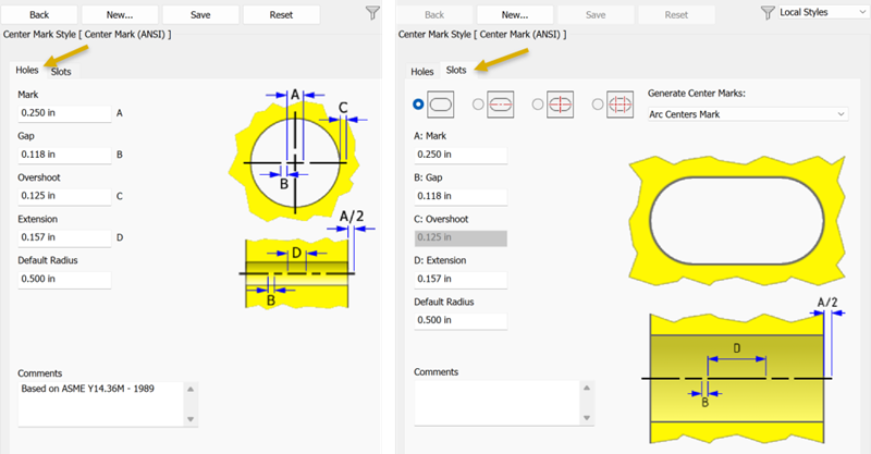 Before you begin a drawing, define a center mark style for hole or slot types.