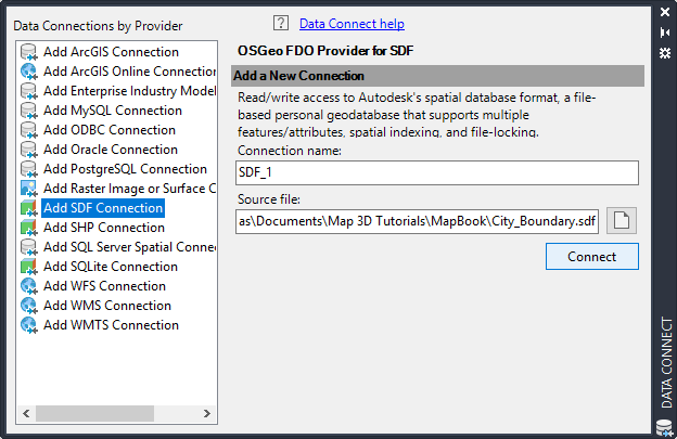 - In the Data Connect window, under Data Connections By Provider (on the left), select Add SDF Connection.