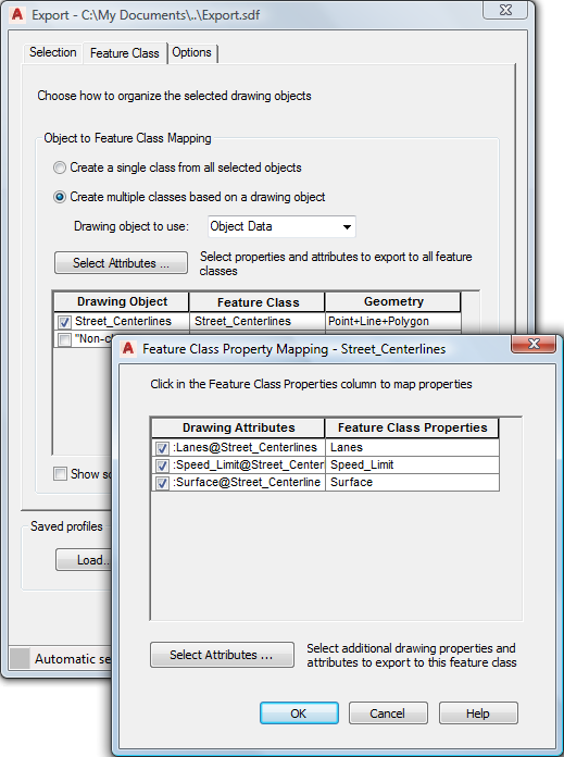 When you export drawing objects, you can use object data to create feature classes in an SDF file. The resulting feature classes have properties that correspond to the object data attributes.
