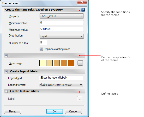 Tie the theme definition to the value of the parcels: lighter colors represent parcels with lower values and darker colors represent parcels with higher values. The parcel value is the "condition" used to determine the color of the parcel in the map.