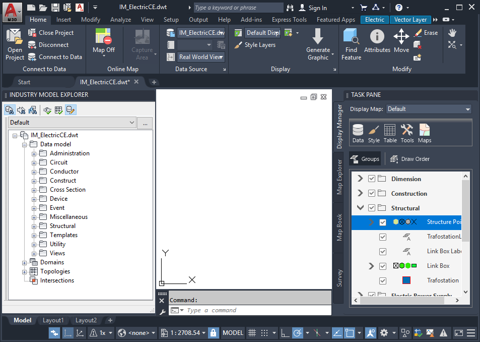 An industry model drawing contains an industry data model. Use industry models to ensure that features you create follow rules and standards, similar to classified drawing data . Industry model drawings have access to advanced functionality, such as feature class forms, reports, and analysis tools. For more information, see About Industry Models.