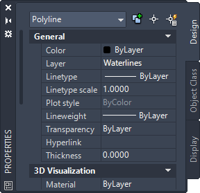 The roads are objects in an AutoCAD drawing. Notice that the current selection is defined as a Polyline. For drawing objects, you can format some properties with the Properties palette.