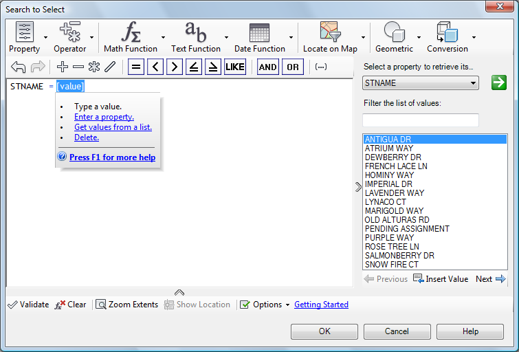 8. Click the green arrow next to STNAME in the properties list to see the street names for the Parcels feature.