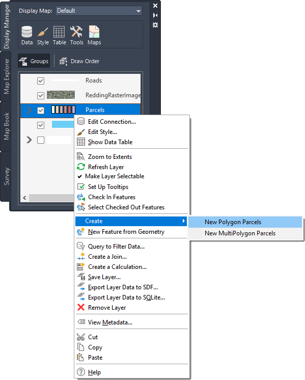 Each item in AutoCAD Map 3D toolset has a custom menu that contains commands available for that item at the current time.