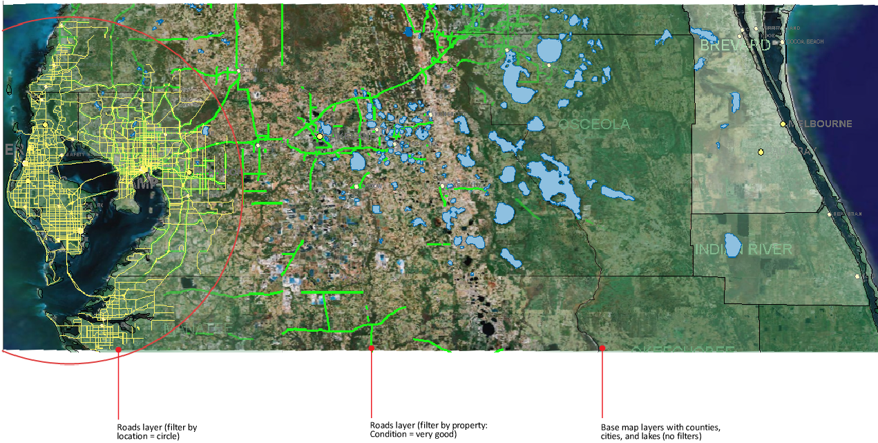 Use a property filter and a location filter to view the condition of roads in a circular area.