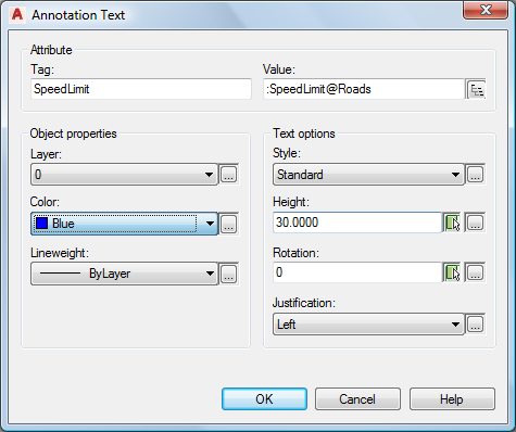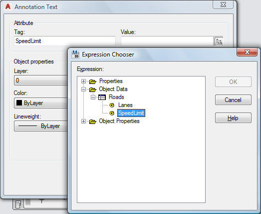 If your drawing contains object data, or is linked to external data, you can specify properties of that data as values for the annotation. These properties are dynamic. When you attach the annotation to objects, each object displays its own value for that property.