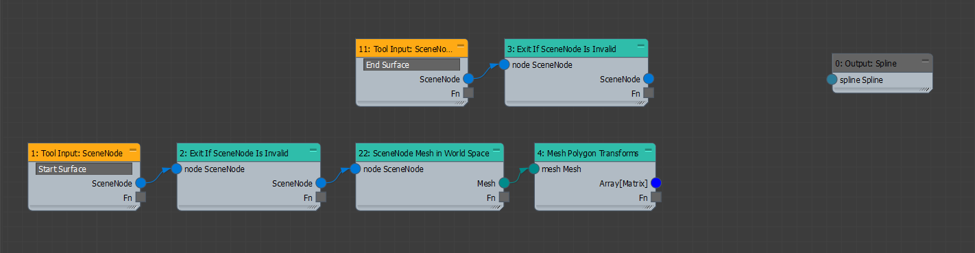 Our tool will need two meshes: one mesh from which the rays will be emitted, the "Start Surface", and one mesh onto which the rays will intersect, the "End Surface". Use two Tool Input: SceneNode operators (Inputs > Tools) to acquire these surfaces. Connect these to Exit If SceneNode Is Invalid (3ds Max > Scene Node) to terminate the graph's execution if these nodes have not yet been picked.