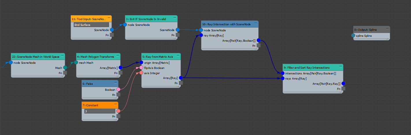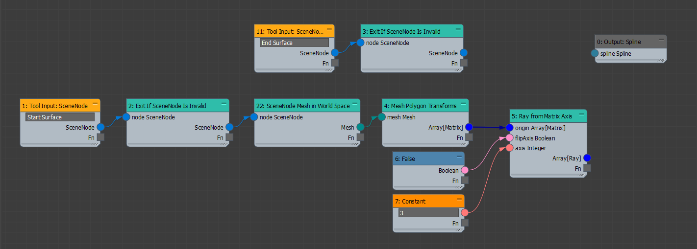 One final detail - the rays which formed this spline were defined in world space, so we must transform this spline into the tool's local space before it can be properly output. To complete this step, invert the Spline: Local to World Matrix with a Matrix Inverse. This creates a world to local matrix, which can be connected into the Transform Spline to transform the spline from world coordinates into local (tool) coordinates.