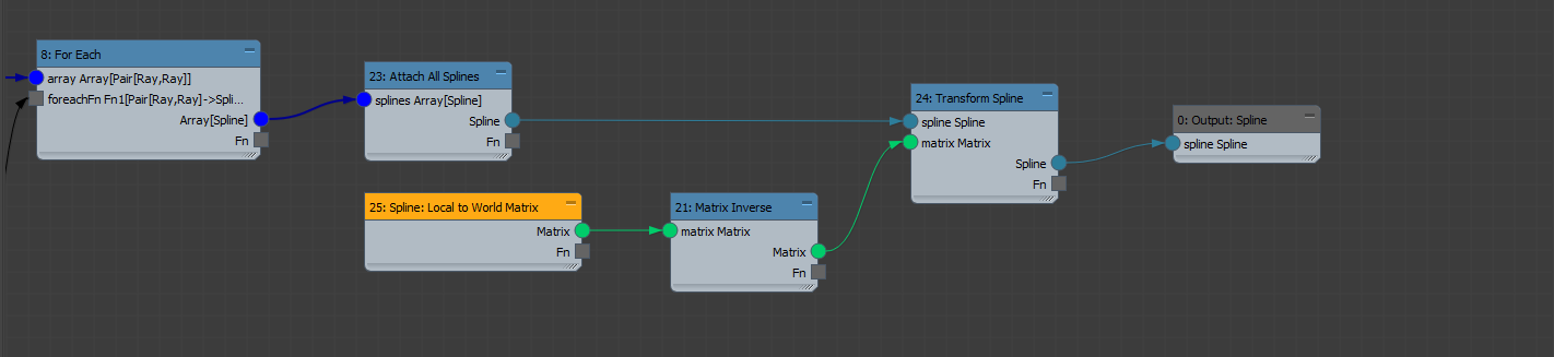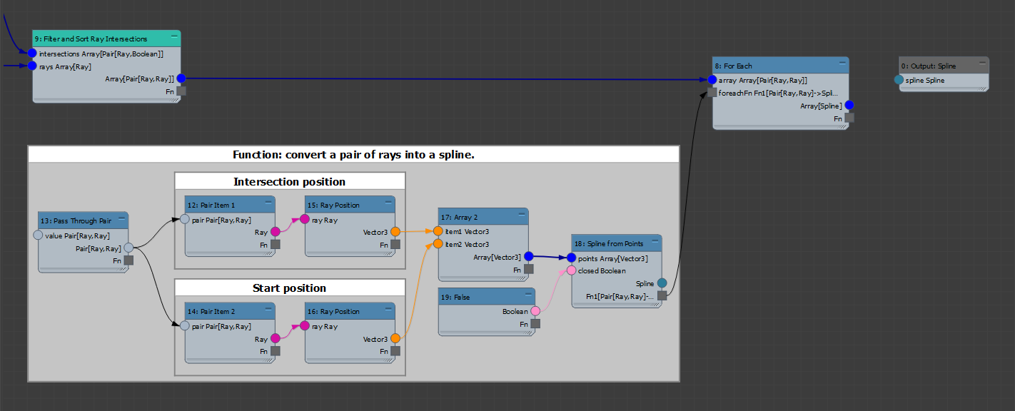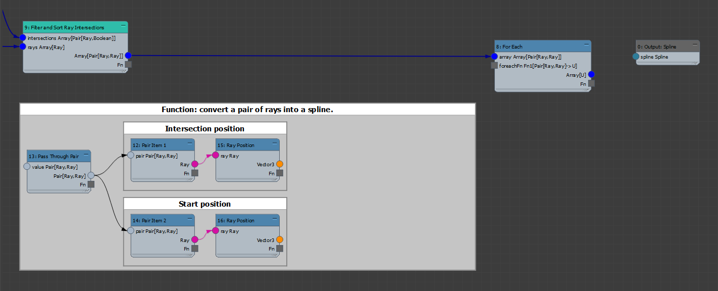Once these connections are made, connect the Fn output from Spline from Points into the foreachFn input. The square Fn connectors are referred to as "Function Connectors". These convert the connected nodes into a function. The unconnected node inputs within a function act as that function's inputs. In our case, the function only has one input, namely the pair of rays: Pair[Ray,Ray]. See here for more information on functions.